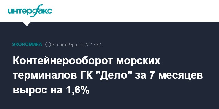 Москва. 4 сентября. INTERFAX.RU - Морская контейнерная перевалка на терминалах группы компаний "Дело" ("ДелоПортс" и "Глобал Портс") по итогам января-июля текущего года выросла на 1,6%. Об этом сообщил первый заместитель генерального директора по стратегии и развитию ГК "Дело" Александр Иодчин на брифинге в рамках ВЭФ-2025.