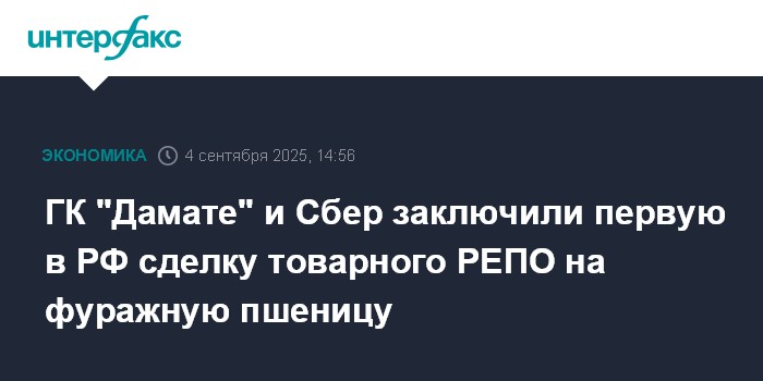 ГК "Дамате" и Сбер заключили первую в РФ сделку товарного РЕПО на фуражную пшеницу