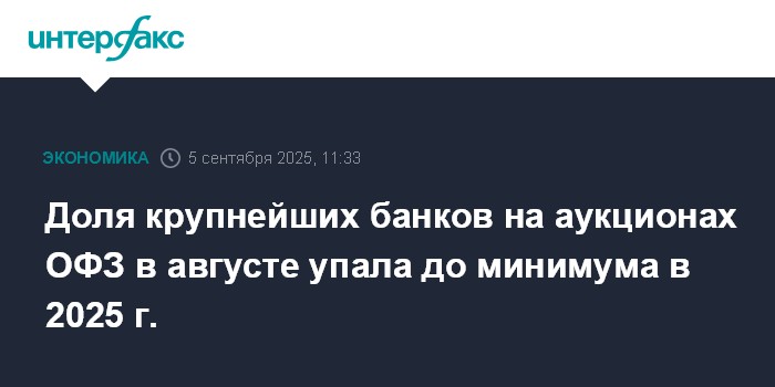 Доля крупнейших банков на аукционах ОФЗ в августе упала до минимума в 2025 г.