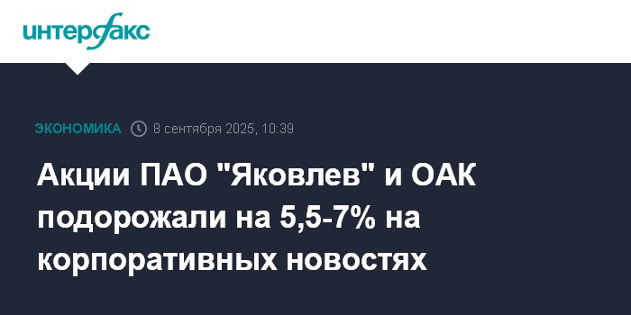 Акции ПАО "Яковлев" и ОАК подорожали на 5,5-7% на корпоративных новостях