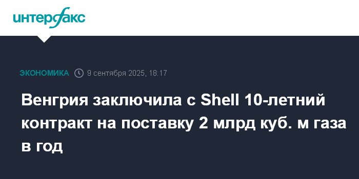 Москва. 9 сентября. INTERFAX.RU - Венгрия заключила десятилетний контракт с Shell на поставку 2 млрд куб. м газа ежегодно, начиная с 2026 года, сообщил глава венгерского МИД Петер Сийярто в социальных сетях.