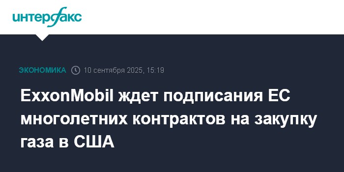 Москва. 10 сентября. INTERFAX.RU - ExxonMobil Corp. ожидает подписания Евросоюзом многолетних контрактов на закупку газа в США в соответствии с условиями торгового соглашения, в рамках которого Брюссель обязался закупить в Штатах энергоресурсы на сумму $750 млрд, пишет Financial Times.