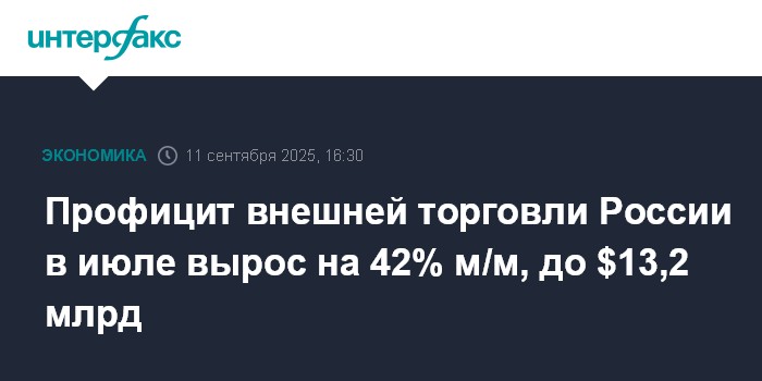 Москва. 11 сентября. INTERFAX.RU - Положительное сальдо внешней торговли товарами России, определенное по методологии платежного баланса, в июле 2025 года увеличилось на 41,6%, до $13,2 млрд, по сравнению с $9,3 млрд в июне, сообщает сайт Банка России.