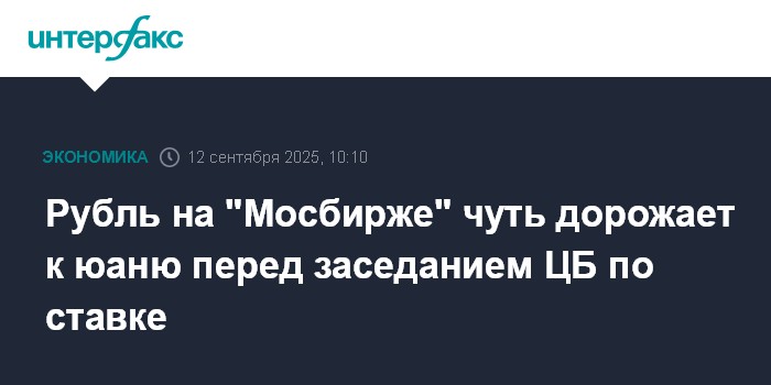 Москва. 12 сентября. INTERFAX.RU - На "Московской бирже" утром в пятницу рубль немного дорожает к юаню, корректируясь вверх перед заседанием Банка России по ключевой ставке.