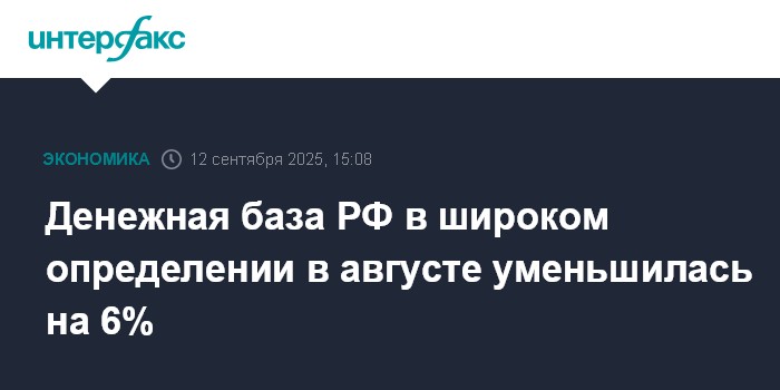 Москва. 12 сентября. INTERFAX.RU - Денежная база РФ в широком определении в августе 2025 года уменьшилась на 1 трлн 723,5 млрд рублей, или на 6%, до 26 трлн 998 млрд рублей, сообщает сайт Банка России.