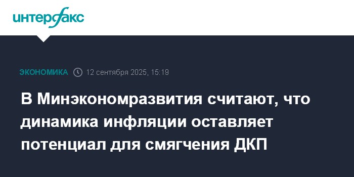 Москва. 12 сентября. INTERFAX.RU - Экономическая активность в РФ существенно замедлилась при одновременном снижении инфляции, динамика цен оставляет потенциал для дальнейшего смягчения ДКП, что крайне важно для своевременного выхода на траекторию устойчивого роста, считают в Минэкономразвития РФ.