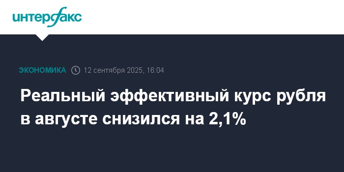 Москва. 12 сентября. INTERFAX.RU - Реальный эффективный курс рубля к корзине валют государств - основных торговых партнеров России в августе 2025 года снизился на 2,1% по отношению к июлю, по предварительной оценке ЦБ, опубликованной на его сайте.