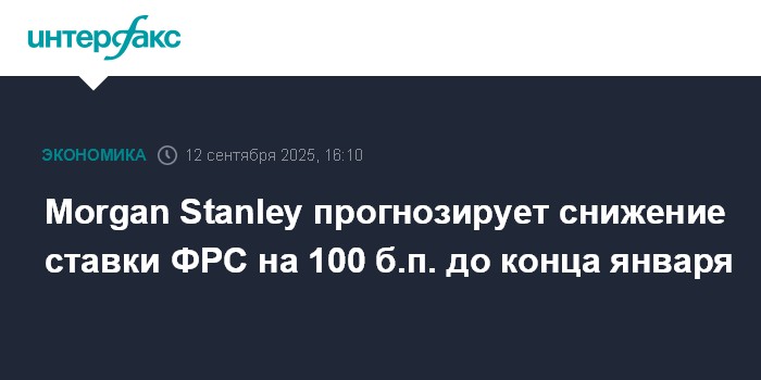 Москва. 12 сентября. INTERFAX.RU - Аналитики Morgan Stanley скорректировали прогноз дальнейших изменений процентной ставки Федеральной резервной системой США и теперь ожидают, что она будет снижена на 100 базисных пунктов до конца января следующего года.