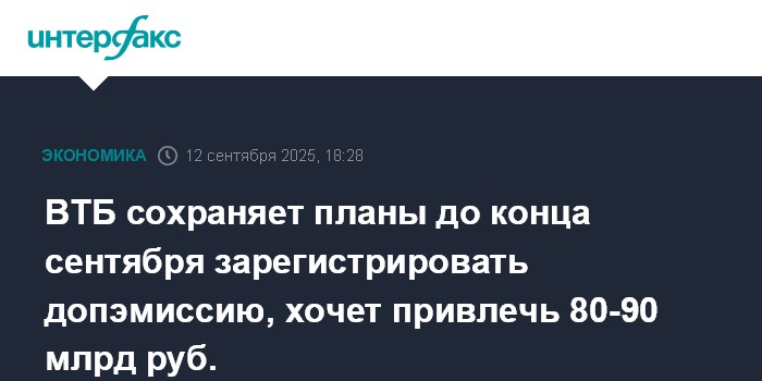 ВТБ сохраняет планы до конца сентября зарегистрировать допэмиссию, хочет привлечь 80-90 млрд руб.