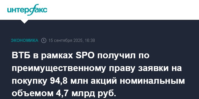 ВТБ в рамках SPO получил по преимущественному праву заявки на покупку 94,8 млн акций номинальным объемом 4,7 млрд руб.