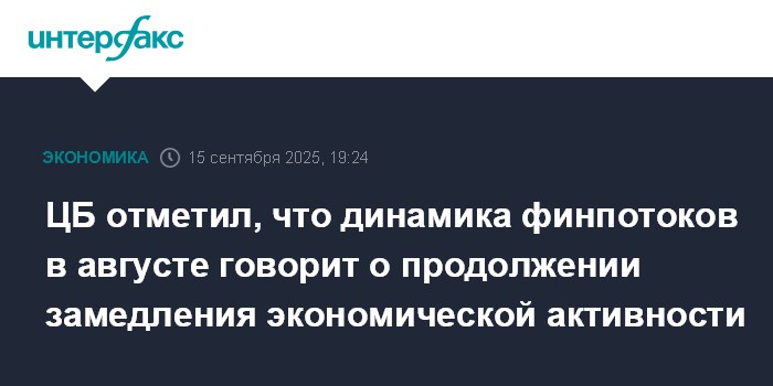 Москва. 15 сентября. INTERFAX.RU - Динамика финансовых потоков в августе говорит о продолжении замедления экономической активности в РФ, говорится в комментарии Банка России.