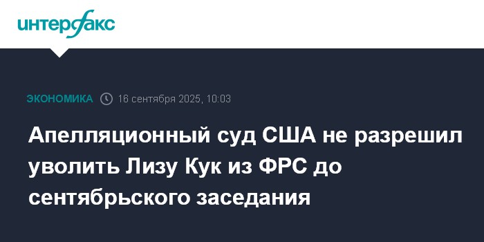Москва. 16 сентября. INTERFAX.RU - Апелляционный суд округа Колумбия в понедельник отклонил ходатайство президента США Дональда Трампа об увольнении члена совета управляющих Федеральной резервной системы (ФРС) Лизы Кук до сентябрьского заседания центробанка.