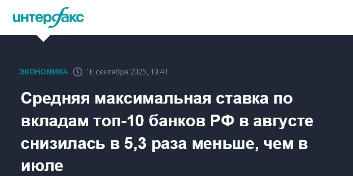 Средняя максимальная ставка по вкладам топ-10 банков РФ в августе снизилась в 5,3 раза меньше, чем в июле