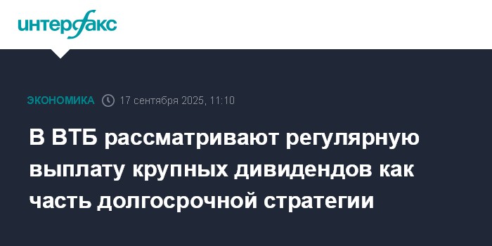 Москва. 17 сентября. INTERFAX.RU - Менеджмент ВТБ рассматривает регулярную выплату крупных дивидендов как часть своей долгосрочной стратегии, говорится в презентации банка для инвесторов.