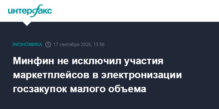 Москва. 17 сентября. INTERFAX.RU - Минфин не исключает участия маркетплейсов, таких как Ozon, "Яндекс.Маркет" и других, в организации электронных магазинов для проведения госзакупок малого объема (ЗМО, до 600 тысяч рублей), рассказала в интервью "Интерфаксу" директор департамента бюджетной политики в сфере контрактной системы Минфина Татьяна Демидова.