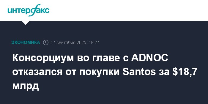 Москва. 17 сентября. INTERFAX.RU - Консорциум покупателей во главе с Abu Dhabi National Oil Co. (ADNOC) отозвал предложение о покупке австралийской газовой компании Santos за $18,7 млрд после нескольких месяцев комплексной проверки.