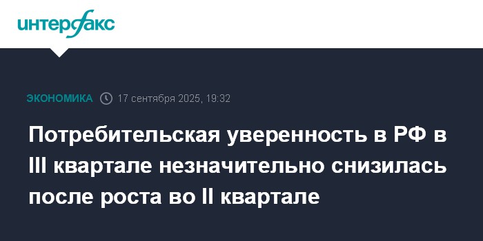 Москва. 17 сентября. INTERFAX.RU - Индекс потребительской уверенности, отражающий совокупные потребительские ожидания населения РФ, в III квартале 2025 года снизился до минус 9% с минус 8% во II квартале после минус 11% в I квартале, минус 9% в IV квартале 2024 года, минус 7% в III квартале, минус 6% во II квартале 2024 года (максимальный уровень с 2014 года), сообщил в среду Росстат (опрос был проведен с 1 по 10 августа).