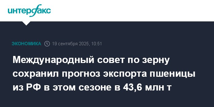 Москва. 19 сентября. INTERFAX.RU - Международный совет по зерну (МСЗ) в сентябрьском обзоре сохранил прогноз экспорта пшеницы из РФ в текущем сельхозгоду (июль 2025-июнь 2026 гг.) на уровне августа - 43,6 млн тонн.