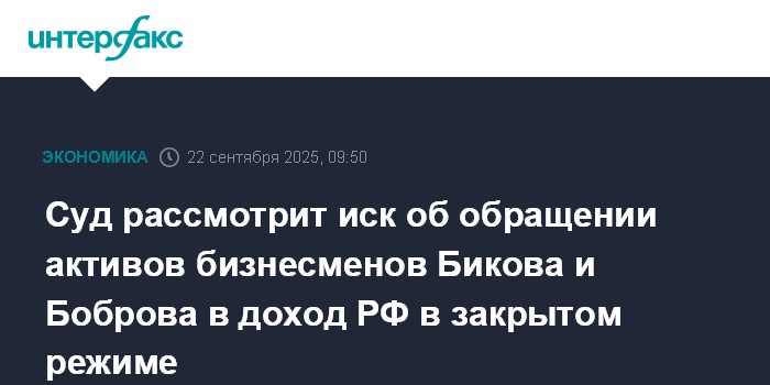 Москва. 22 сентября. INTERFAX.RU - Ленинский районный суд Екатеринбурга будет рассматривать иск Генпрокуратуры РФ об обращении в доход государства ООО "Корпорация СТС", ООО "Интертехэлектро - Новая генерация", ООО "Курганская ТЭЦ" и других активов бизнесменов Алексея Боброва и Артема Бикова в закрытом режиме, передал корреспондент "Интерфакса" из зала суда.
