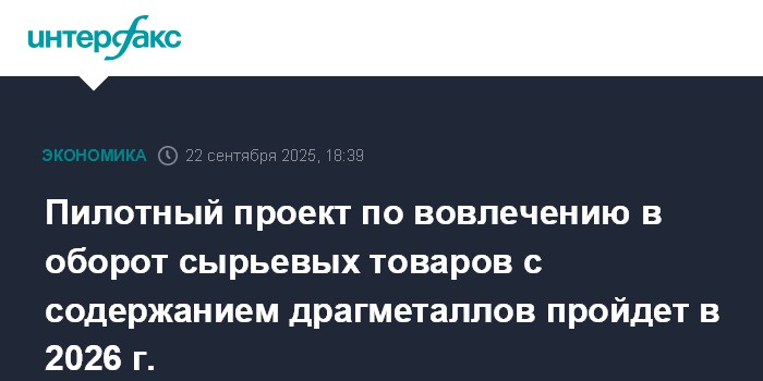 Москва. 22 сентября. INTERFAX.RU -Пилотный проект по вовлечению в оборот сырьевых товаров с содержанием драгметаллов будет реализован в России в 2026 году. Соответствующий указ президента опубликован на официальном интернет-портале правовой информации.