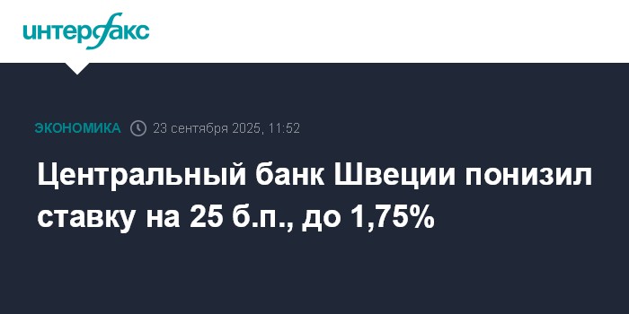 Москва. 23 сентября. INTERFAX.RU - Риксбанк (Центральный банк Швеции) понизил ключевую процентную ставку на 25 базисных пунктов - до 1,75% годовых. Решение стало неожиданностью для аналитиков, опрошенных Trading Economics, прогнозировавших сохранение ставки на прежнем уровне.