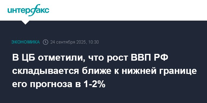 Москва. 24 сентября. INTERFAX.RU - Динамика ВВП РФ складывается ближе к нижней границе прогноза ЦБ РФ (рост в 2025 году на 1-2%), сценария перехода экономики к спаду в повестке нет, заявил советник председателя Банка России Кирилл Тремасов.