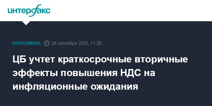 Москва. 24 сентября. INTERFAX.RU - Финансирование дополнительных расходов за счет налогов при неизменности плана по возвращению к нулевому структурному дефициту бюджета в целом не отразится на устойчивой составляющей инфляции, краткосрочные вторичные эффекты от повышения НДС в части влияния на инфляционные ожидания Банк России учтет и отразит в обновленном октябрьском прогнозе, сообщили журналистам в пресс-службе ЦБ.