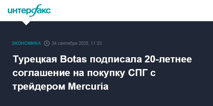 Москва. 24 сентября. INTERFAX.RU - Турецкая госкомпания Botas подписала соглашение на 20 лет с трейдером Mercuria о поставках сжиженного природного газа, сообщил в соцсети министр энергетики Турции Альпарслан Байрактар.