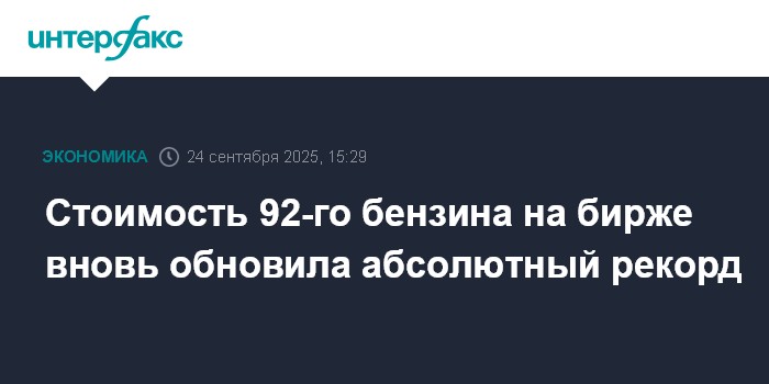 Москва. 24 сентября. INTERFAX.RU - Стоимость Аи-92 на Петербургской бирже достигла нового рекорда по индексу европейской части РФ, который учитывается в формуле расчета демпфера для нефтяных компаний, свидетельствуют данные площадки.