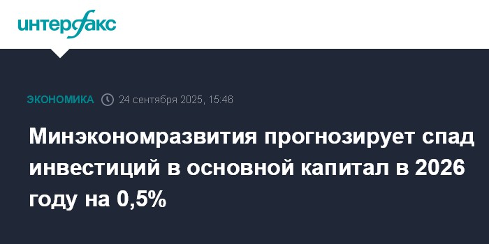 Москва. 24 сентября. INTERFAX.RU - Минэкономразвития в базовом сценарии сохранило прогноз роста инвестиций в основной капитал в России в 2025 году на уровне 1,7%, но теперь ожидает снижения инвестиций в 2026 году на 0,5% (вместо роста на 3,0% в апрельской версии), сообщил журналистам представитель министерства.