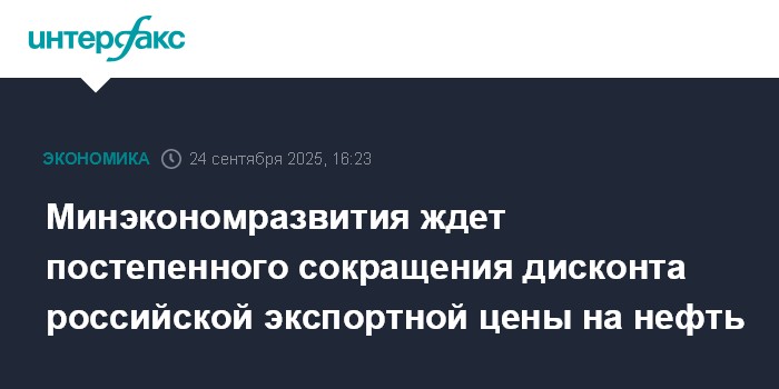 Москва. 24 сентября. INTERFAX.RU - Минэкономразвития ожидает постепенного сокращения дисконта российской экспортной цены на нефть. Об этом заявил глава Минэкономразвития Максим Решетников, выступая на заседании правительства, на котором рассматривается макропрогноз министерства на 2025-2028 годы.