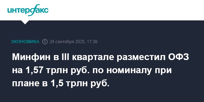 Москва. 24 сентября. INTERFAX.RU - Министерство финансов России в III квартале 2025 года разместило облигации федерального займа (ОФЗ) на общую сумму почти 1,57 трлн рублей по номиналу (без учета дополнительных размещений после аукционов 24 сентября) при квартальном плане в 1,5 трлн рублей по номиналу. Объем выручки (объем средств, вырученных от продажи ОФЗ по рыночной стоимости) составил 1,389 трлн рублей.