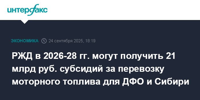 Москва. 24 сентября. INTERFAX.RU - ОАО "Российские железные дороги" (РЖД) в 2026-2028 гг. может получить почти 21 млрд руб. субсидий на возмещение недополученных доходов, возникающих в результате установления льготных тарифов на перевозку ж/д транспортом во внутрироссийском сообщении моторного топлива, предназначенного для реализации на территории РФ, в направлении Дальневосточного федерального округа и отдельных российских субъектов, входящих в состав Сибирского федерального округа. Об этом говорится в пояснительной записке к проекту бюджета, с которой ознакомился источник "Интерфакса".