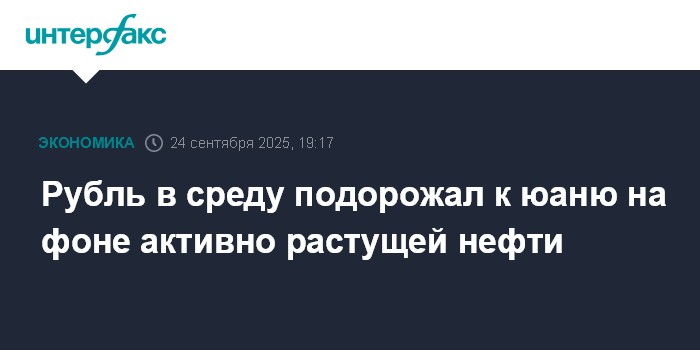 Москва. 24 сентября. INTERFAX.RU - Китайский юань опустился на Московской бирже по итогам торгов в среду, рубль подорожал на фоне активно растущей нефти. Курс китайской валюты в 19:00 мск составил 11,663 руб., что на 4,1 коп. ниже уровня закрытия предыдущих торгов.