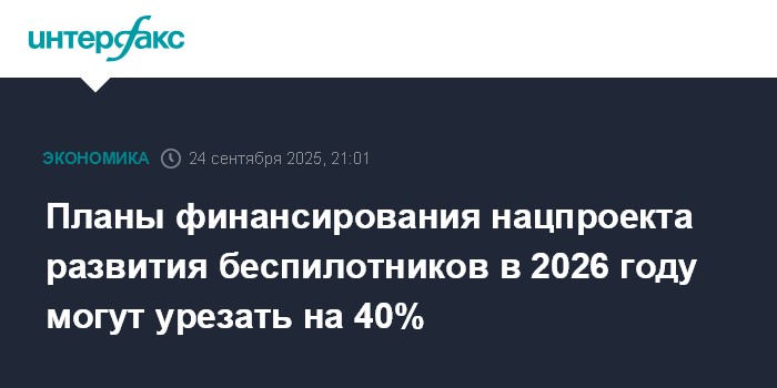 Москва. 24 сентября. INTERFAX.RU - Объем финансирования нацпроекта "Беспилотные авиационные системы" (БАС) в 2026 году может составить 26 млрд руб. Об этом сообщил "Интерфаксу" источник, ознакомившийся с пояснительной запиской к проекту федерального бюджета на ближайшую трехлетку.