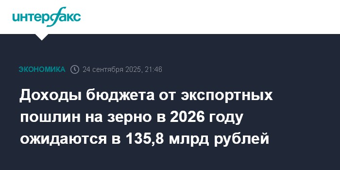 Москва. 24 сентября. INTERFAX.RU - Доходы федерального бюджета от экспортных пошлины на зерно в 2026 году предусмотрены в 135 млрд 820,3 млн рублей, что почти в 1,8 раза больше, чем в 2025 году (76 млрд 426 млн рублей). Об этом сообщил "Интерфаксу" источник, знакомый с содержанием пояснительной записки к проекту бюджета на следующую трехлетку.