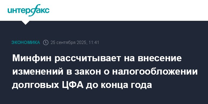 Москва. 25 сентября. INTERFAX.RU - Минфин рассчитывает на внесение изменений в законодательство, которые позволят учитывать расходы на выпуск долговых цифровых финансовых активов (ЦФА) в общей базе по налогу на прибыль организаций, до конца текущего года, заявил замминистра финансов Иван Чебесков.