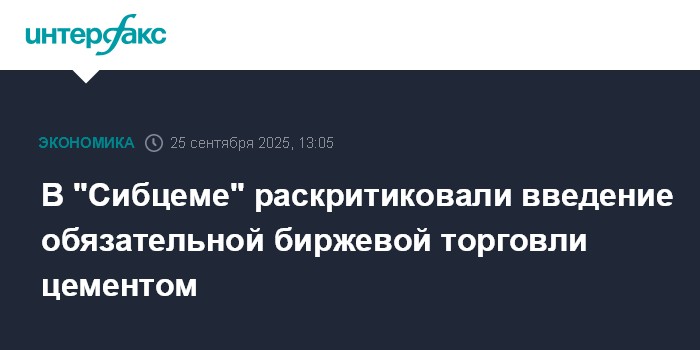 Москва. 25 сентября. INTERFAX.RU - Обязательная биржевая торговля цементом, которую введут с 1 марта 2026 года, негативно скажется на отрасли и потребителях, заявил директор по маркетингу АО "ХК "Сибцем" Андрей Рубцов на межрегиональном строительном форуме "СтроимСибирь-2035" в Кемерове.