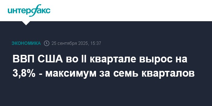 Москва. 25 сентября. INTERFAX.RU - Экономика США во втором квартале 2025 года увеличилась на 3,8% в пересчете на годовые темпы, согласно окончательным данным министерства торговли страны.
