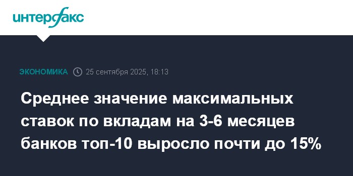 Москва. 25 сентября. INTERFAX.RU - Среднее арифметическое значение максимальных процентных ставок по вкладам в рублях на срок от 3 до 6 месяцев (без учета вкладов с дополнительными условиями) десяти российских банков, привлекающих наибольший объем депозитов физлиц, во второй декаде сентября 2025 года увеличилось до 14,96% годовых с 14,79% в первой декаде, сообщает сайт ЦБ.