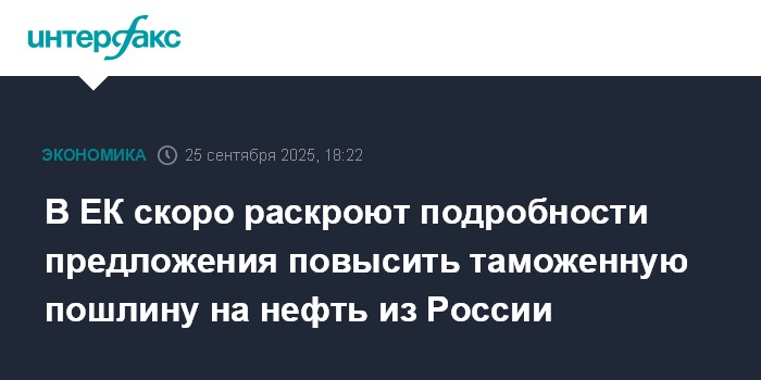 Москва. 25 сентября. INTERFAX.RU - План повысить таможенную пошлину Евросоюза на российскую нефть объясняется намерением ЕС оказать дополнительное давление на российскую экономику, заявил на брифинге пресс-секретарь Еврокомиссии Олоф Жилл.