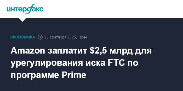 Москва. 26 сентября. INTERFAX.RU - Amazon.com Inc. заплатит $2,5 млрд для урегулирования иска Федеральной торговой комиссии США (FTC), обвинившей компанию в недобросовестной практике привлечения клиентов в ее программу Prime, сообщают западные СМИ со ссылкой на судебные документы.