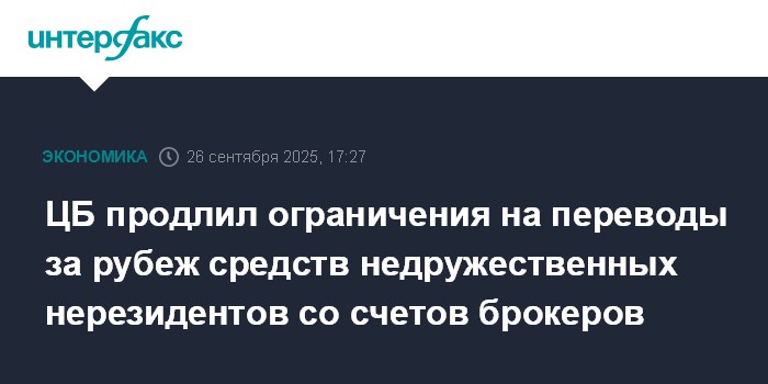 Такие операции ЦБ приостанавливает на период с 1 октября 2025 года до апреля 2026 года. Ограничения касаются переводов со счетов как физических, так и юридических лиц, открытых у российских брокеров и доверительных управляющих. Эти меры были введены 1 апреля 2022 года.