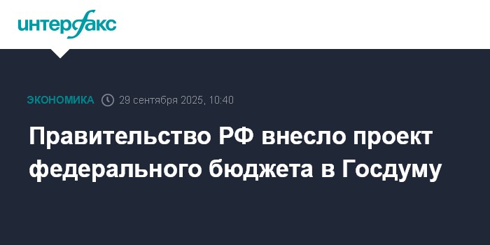 Москва. 29 сентября. INTERFAX.RU - Правительство РФ внесло в Госдуму проект федерального бюджета на 2026 год и плановый период 2027-2028 годов, сообщила пресс-служба кабинета министров.