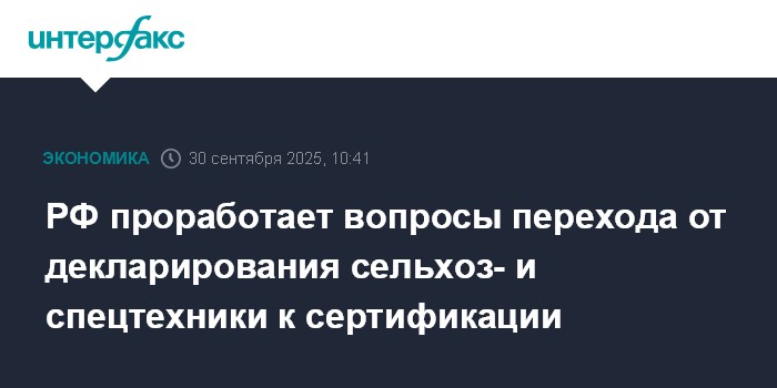 Москва. 30 сентября. INTERFAX.RU - Правительство РФ проработает вопрос о переходе от декларирования (подтверждение самим производителем/продавцом) к обязательной сертификации (подтверждение независимым органом) сельскохозяйственной и специализированной техники для ее проверки на соответствие техрегламенту при выходе на российский рынок.
