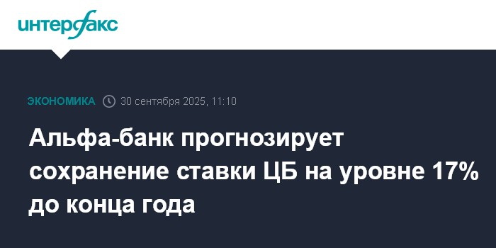 Москва. 30 сентября. INTERFAX.RU - Альфа-банк прогнозирует сохранение ключевой ставки Банка России на уровне 17% до конца текущего года, говорится в обзоре главного экономиста банка Наталии Орловой. Ранее эксперт ориентировалась на ее снижение до 15%.