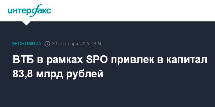ВТБ в рамках SPO привлек в капитал 83,8 млрд рублей