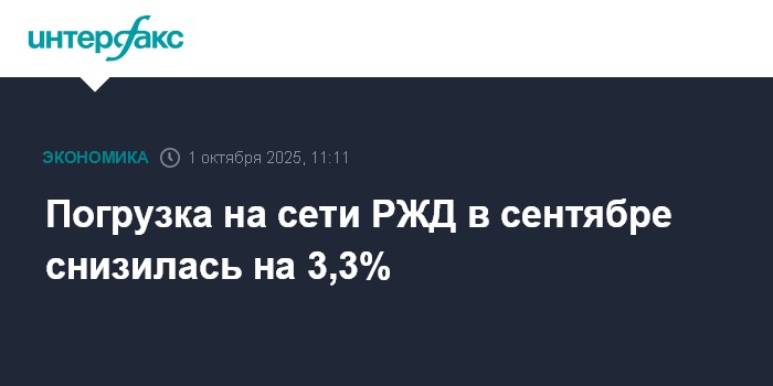 Москва. 1 октября. INTERFAX.RU - Погрузка на сети ОАО "Российские железные дороги" в сентябре 2025 г. составила 91,4 млн тонн, что на 3,3% меньше, чем за аналогичный период прошлого года, сообщила компания.