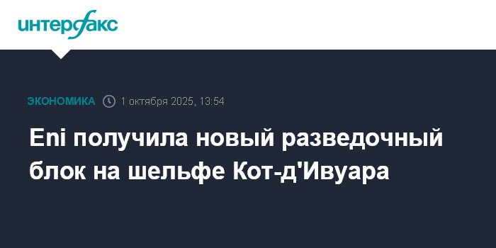 Москва. 1 октября. INTERFAX.RU - Итальянская энергетическая Eni подписала с Министерством горных, нефтяных и энергетических ресурсов Кот-д'Ивуара контракт на разведку блока CI-707 на иворийском шельфе, сообщила компания.