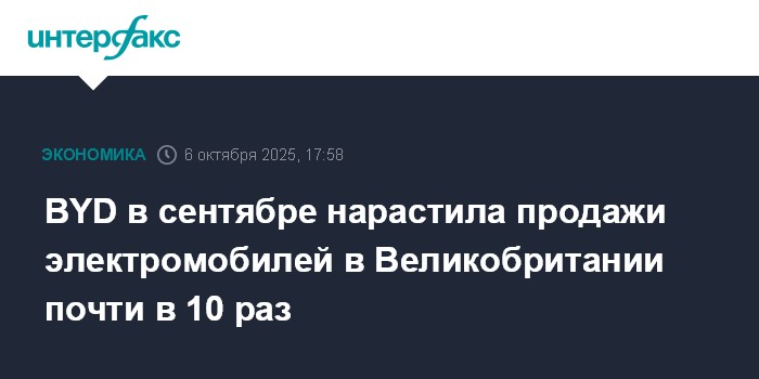 Москва. 6 октября. INTERFAX.RU - Китайская BYD в сентябре увеличила продажи электромобилей в Великобритании в 9,8 раза в годовом выражении, сообщил автопроизводитель.